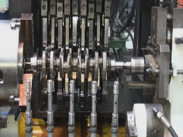 3.滾壓四缸機(jī)曲軸:滑臺(tái)橫向進(jìn)給,九個(gè)夾鉗油缸通過(guò)滾壓頭分別夾緊工件上各自對(duì)應(yīng)的主軸頸和連桿頸,此時(shí)潤(rùn)滑油開。滾壓時(shí)九個(gè)夾鉗油缸按預(yù)定壓力進(jìn)行加卸載,按設(shè)定滾壓圈數(shù)完成滾壓。滾壓完成后滾壓裝置退出。